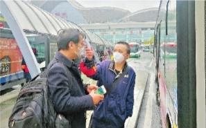 3月27日,公交随车管理员正在给一位准备上车的乘客测量体温 长江日报记者张宁摄