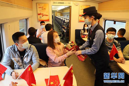 图为武汉客运段乘务人员为旅客送上鲜花 新华网发 刘娟摄黄金周期间,武铁各站将严格落实站车测温、通风换气、卫生保洁、日常消毒等疫情防控措施,推行刷脸进站、扫码点餐等无接触服务。在做好旅客运输工作的同时,铁路部门也加强了货运组织,确保假日重点物资供应。