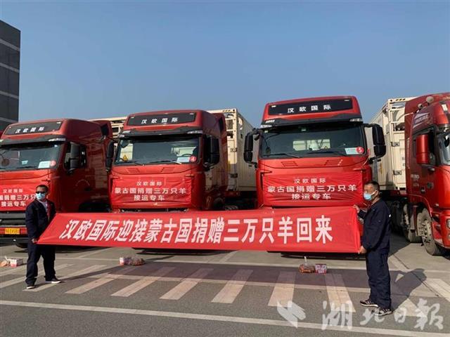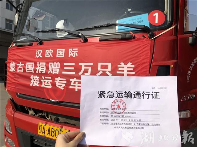 武汉汉欧国际物流有限公司举行“蒙古国捐赠三万只羊接运专车”发车仪式。(汉欧国际供图)据了解,本次汉欧国际接运蒙古国捐赠湖北三万只羊事项得到了湖北省交通厅、湖北省商务厅、省慈善总会、武汉港航发展集团等单位及北京英菲蒂克国际贸易有限公司、中农联控股有限公司、中国人民财产保险股份有限公司武汉市分公司、中车长江车辆有限公司、英铁瑞国际货运代理(上海)有限公司、北京跨欧亚国际货运代理有限公司、北京逸浚供应链管理有限公司、华安财产保险股份有限公司、上海开利运输冷气设备有限公司等方面的大力支持。湖北省交通厅特意为集卡开具了“紧急运输通行证”,确保运输路上一路“绿灯”。