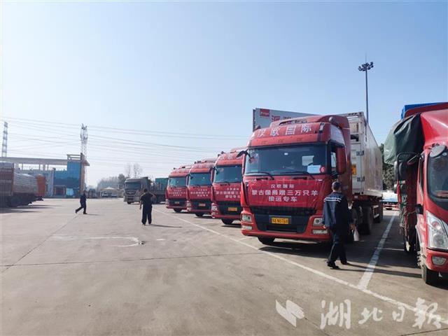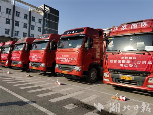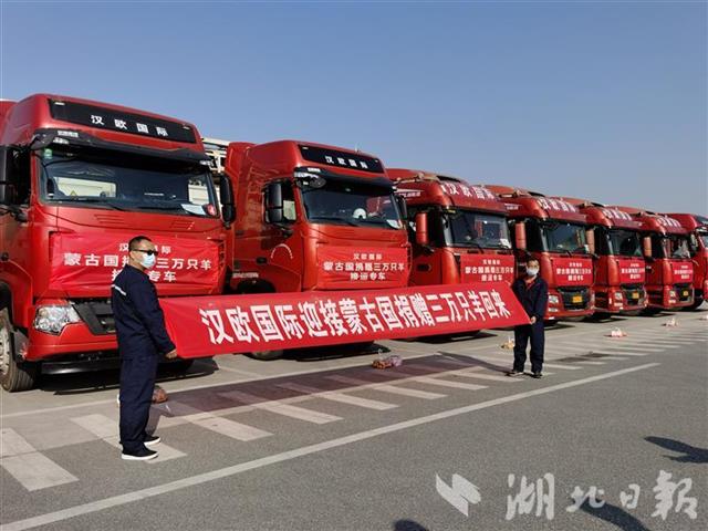 武汉汉欧国际物流有限公司举行“蒙古国捐赠三万只羊接运专车”发车仪式。(汉欧国际供图)湖北日报讯(记者刘天纵、林晶、通讯员王遥遥)发车!接三万只蒙古羊来湖北!11月9日上午,在武汉东西湖保税物流中心,武汉港航发展集团旗下子公司武汉汉欧国际物流有限公司举行“蒙古国捐赠三万只羊接运专车”发车仪式,首批十辆冷链集装箱卡车出发,驶向内蒙古二连浩特,预计11月15日将首批1.2万只羊运回武汉。