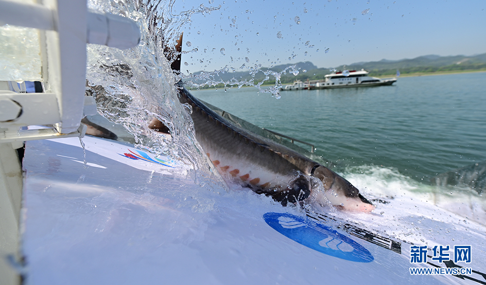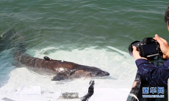 图为佩戴卫星标记的中华鲟。新华网发 郑斌摄