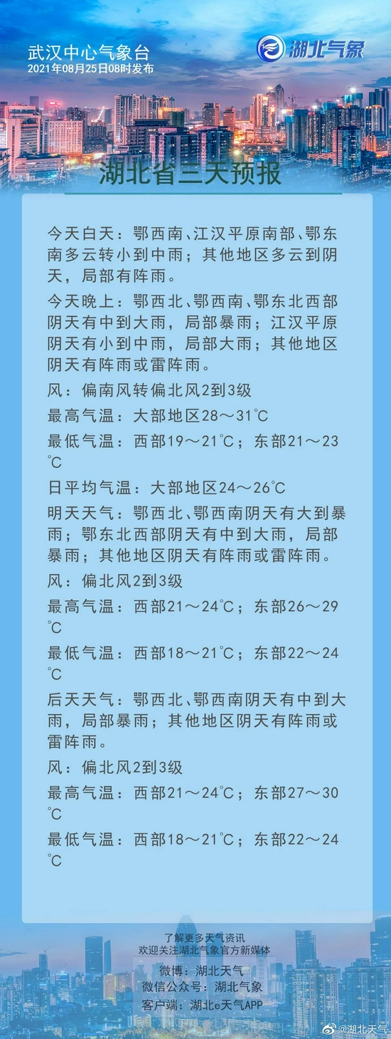 今晚(8月25日)到明天(8月26日),我省西部将有较强降水发生,鄂西北、鄂西南阴天有大到暴雨,鄂东北西部阴天有中到大雨,局部暴雨,其他地区阴天有阵雨或雷阵雨。