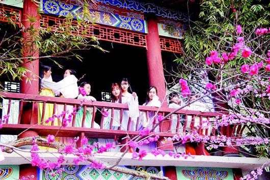 湖北日报讯 昨日,武汉生物工程学院第七届桃花文化节在该校桃园广场举行。百余名青年学子着汉服踏春、赏花,重现中国传统节日“上巳节”。每年农历三月初三是传统上巳节。图为学子身着汉服在桃花潭赏花。 (记者 孙文 视界网 肖亚慧 摄)