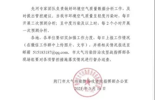《通知》要求武汉市生态环境局做好污染天气预测预报,及时发布预警信息和健康提示。武汉市气象局做好人工增雨作业准备, 一旦具备条件,立即开展人工增雨作业。