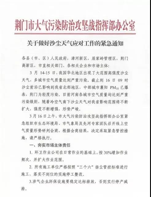 为加强3月16日、17日沙尘天气污染管控工作,《武汉市空气质量办关于加强沙尘天气污染管控工作的通知》(以下称《通知》)推出相关应对措施。