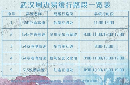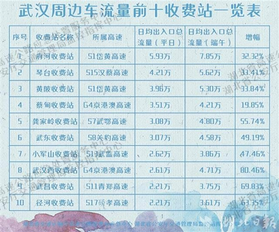 据预测,通行高速公路的车流以探亲流、旅游客流为主,车程1-2小时的周边短途游仍是主流。由此,武汉周边高速压力较大。京港澳高速武汉西、武汉北收费站,岱黄高速府河、黄陂收费站,汉蔡高速琴台收费站,武鄂高速龚家岭收费站,关豹高速武东收费站,武监高速小军山收费站,青郑高速武昌收费站,硚孝高速泾河收费站等10大收费站车流将增长20%以上,其中京港澳高速武汉西车流增幅预计达80%。此外,沪渝高速侏儒互通处、沪蓉高速汉川至东西湖段、京港澳高速东西湖互通处、京港澳高速蔡甸至武汉北段、汉蔡高速红庙互通处高峰时段容易拥堵。
