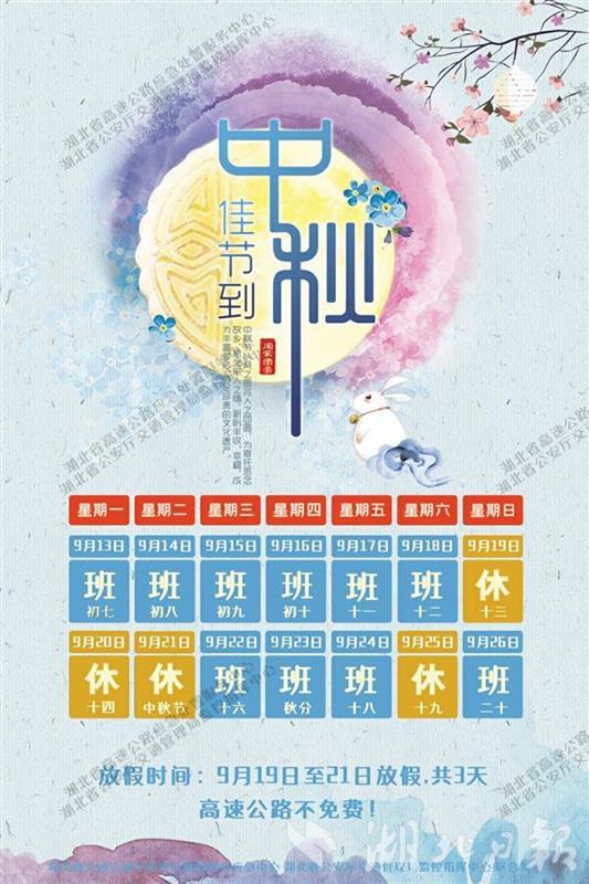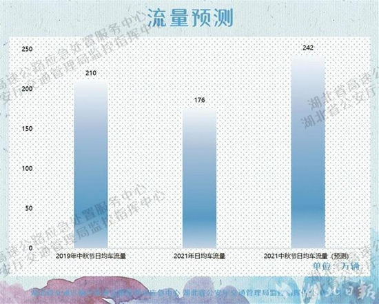 湖北日报讯 (记者戴辉、通讯员李文立、陈燕)9月17日,省交通运输厅高管局发布“中秋”假期全省高速公路出行指南显示,假期高速公路不实行小型客车免费通行政策,预计三天小长假日均出入口车流量约为242万辆(不含省际流量),较2019年同期增长15%,较平日日均增长37.5%。