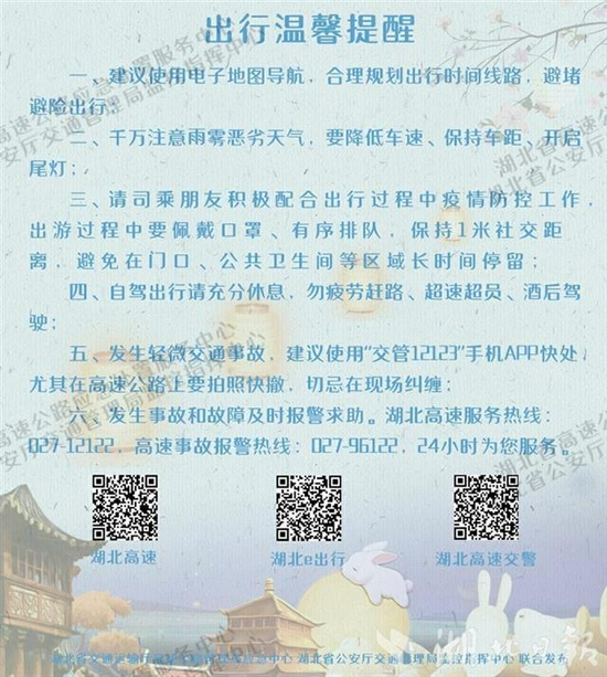 高管部门提醒,高速公路收费站车流量较大时,可从相邻收费站下高速公路,绕行国、省道会更加快捷。目前,武汉市各环线及出城快速通道与高速公路互联互通,进出武汉市的车辆可根据实际情况避开易堵路段灵活绕行。