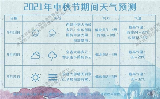 预计在9月18日,16时至21时期间车流量较日常略有增幅,主要在省内重点城市收费站进出口。9月19日假期第一天,预计上午9时至11时期间,出现间歇性出城小高峰。9月21日16时至19时期间,会有间歇性返程小高峰。
