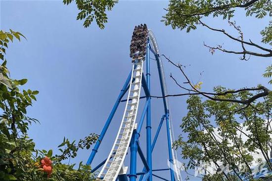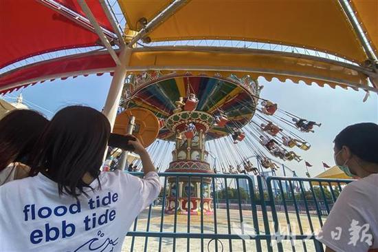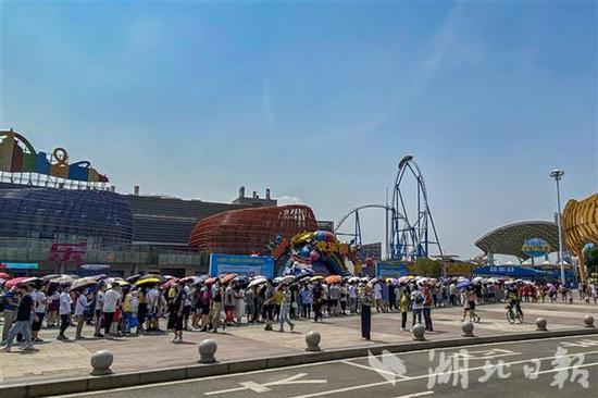 游客正在排队体验园内的娱乐设施。 游客正在体验园内的旋转观光塔,从高空一览东湖及园区的风景。 游客正在体验园内的娱乐设施。 游客在广场前排起长队,等待入园。