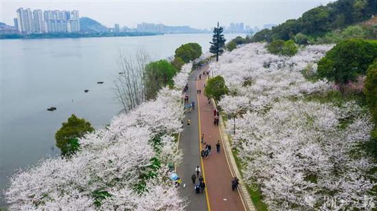 荆州市中山公园内的樱花长廊北起春秋阁,南抵公园南大门,全长300米左右,三月,400多珠早樱次递开放,仿佛是一团团粉白的云海,掩映在绿树碧湖旁,前来打卡拍照的游人络绎不绝,在花香与暖风中感受浓浓的春意。