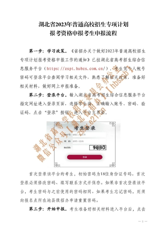 请符合条件的考生在规定时间内登录“湖北省高考招生综合信息服务平台”(网址http://zspt.hubzs.com.cn),按要求提交材料,完成网上申报。