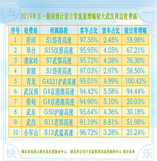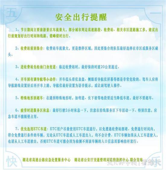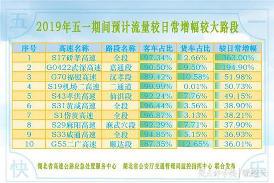 (记者胡勇谋通讯员叶密雷颖吴海鹏)今天,湖北省高速公路管理局发布消息称,2019年“五一”假期将至,根据历年来我省高速路网运行动态分析,武汉市周边、部分路段和通往省内知名景区高速公路交通流量将出现明显增幅。省高速公路应急处置服务中心、省公安厅交通管理局监控指挥中心联合编制了“2019年“五一”假期湖北高速公路出行指南”,服务社会公众安全快捷出行。