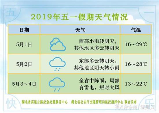 根据最新气象资料综合分析,预计2019年五一假期(5月1~4日)期间,1-2日我省大部分地区以多云天气为主,5月3~4日全省有一次中等强度降水过程发生。具体预报如下: