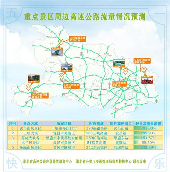 “五一”期间,全省公众出行以春游、踏青、爬山、赏花线路为主,黄陂木兰山、宜昌三峡大坝、武当山、神农架、恩施大峡谷、麻城龟峰山等重点景区周边高速公路及站口交通流量会出现明显增幅。