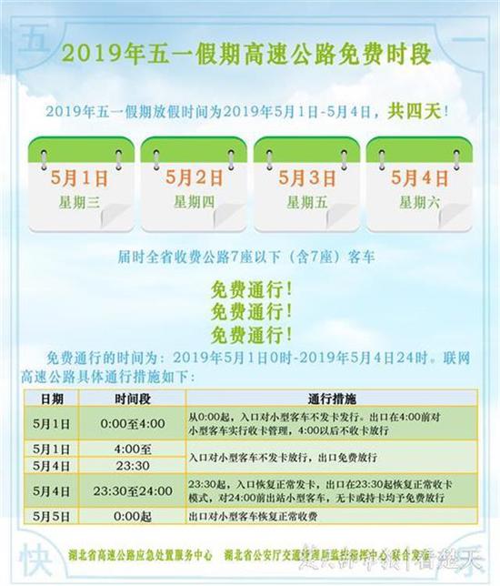 与往年不同,2019年五一劳动节假期增加一天,放假时间为5月1日-5月4日,共四天,高速公路将继续实行7座以下(含7座)小型客车免费通行政策,免费通行的时间为2019年5月1日0时至2019年5月4日24时。