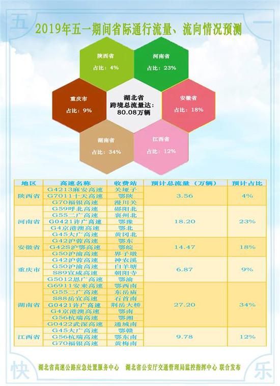由于2019年“五一”假期增加一天,预计小长假期间,跨省出入口总流量较去年同期将增长5%左右,约80.08万辆。根据历年来省界收费站车流量数据分析预测,湖北省与湖南省交流最为频繁,预计占跨省车流量的34%。出入陕西省的交通量最小,占比约为4%。预计增幅较大的省界收费站为G0421许广高速鄂豫收费站。
