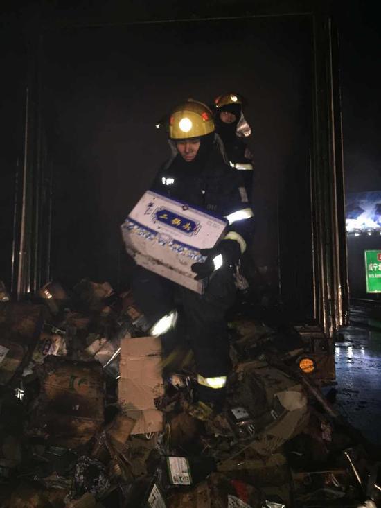 咸宁消防特勤大队派出30多名消防官兵灭火,晚8时许,事故现场明火被扑灭,消防官兵转移货物,扑灭余火。