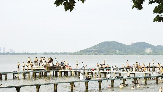 市民在武昌东湖凌波门栈桥亲水避暑。 (湖北日报全媒记者 何宇欣 摄)清凉家电防暑药“俏崩”了