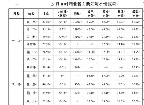 受降雨影响,全省江河湖库水位明显上涨。15日8时,长江干流宜昌至九江段水位除枝城站、沙市站略有下落外,其余各站均呈上涨之势;汉江中下游干流除黄家港站、皇庄站外,其余各站水位均上涨较快,最大涨幅0.75米;中小河流水位部分站点涨落幅度较大,洪湖水位超汛限0.72米。6月14日,全省200座中小水库水位超汛限。不过,总体而言,目前全省汛情平稳,长江、汉江、中小河流水位均在设防以下,除洪湖外五大湖和大型水库水位均在汛限以下。