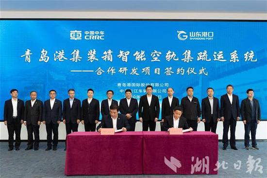 湖北日报讯 (记者成熔兴)11月15日获悉,日前山东港口青岛港与来自武汉的中车长江集团长江公司,在青岛港全自动化集装箱码头举行前湾港区智能货运空轨项目签约仪式,标志着由武汉智造、全球首创的首条智能空轨集疏运系统将落地山东港口青岛港。该项目将成为轨道交通与港口跨行业融合创新的合作典范,贯彻国家“交通强国”战略的具体实践。