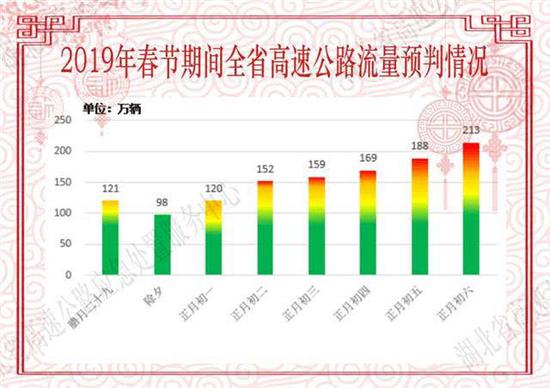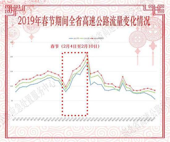 春节期间,预计全省高速公路出口流量1099万辆,较上年同比增长约10%,日均约157万辆。初五和初六为返程高峰,初六车流量达到春运最高峰值,约213万辆。