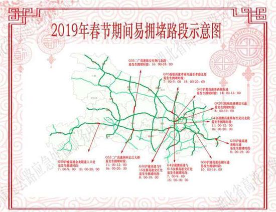 省高管局相关人士介绍,根据往年监测,今年春节最易发生堵车的路段是:G55二广高速陈安至荆门北、荆州长江大桥;G70福银高速孝南互通至孝感北;G50沪渝高速沪渝向金龙隧道入口、侏儒互通、花湖互通、黄梅互通;G42沪蓉高速汉川至东西湖互通;S15汉蔡高速红庙互通;G4京港澳高速蔡甸至武汉北;G4201绕城高速横店互通。