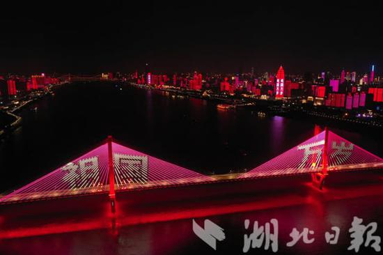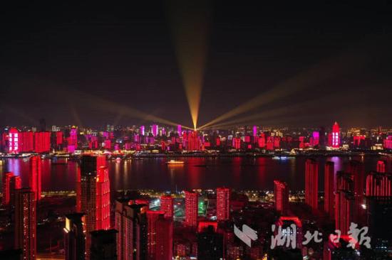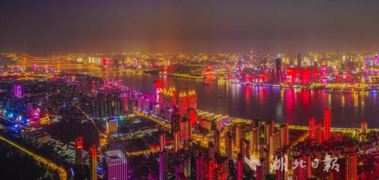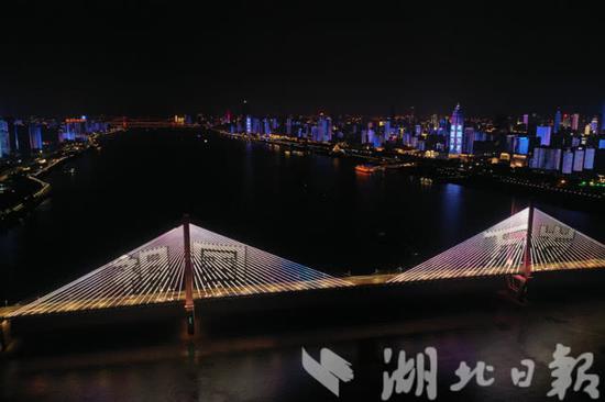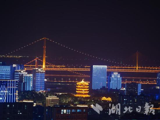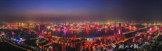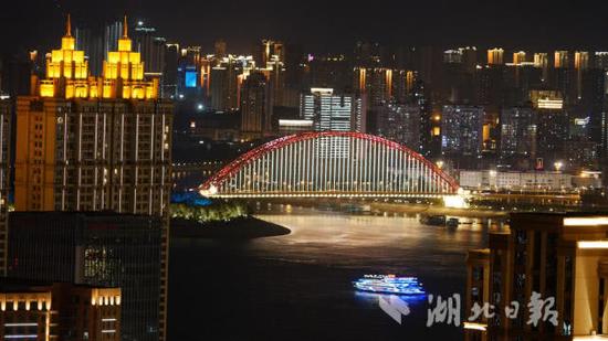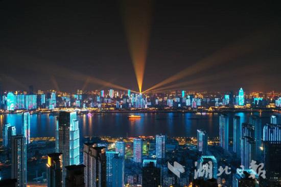 (湖北日报记者 梅涛 摄) (湖北日报记者 梅涛 摄) (湖北日报记者 倪娜 摄) (湖北日报记者 倪娜 摄)长江大桥、长江二桥等横跨长江、汉江的七座桥梁,龟山和蛇山,龟山电视塔,知音号及多艘长江游轮,沿江1000多栋建筑,以及滚滚长江和夜空,共同构成绵延13公里的长距离、多维度立体巨幕。