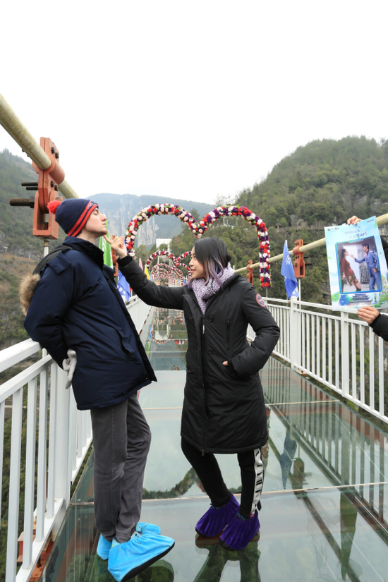 嘉宾们走上玻璃栈桥的那一刻无比感到兴奋和刺激,从脚下透过玻璃可以清晰的看到山谷最底端的河流,来自美国的达人@最帅的老外_卫来 连声表示“腿软、害怕”。不过,在克服了恐惧后,达人们便乐在其中,尽情感受着置身于山水之间的轻松与畅快。主办方的工作人员还设置了摆拍模仿的小游戏,大家掌声笑声连连,玩得不亦乐乎。