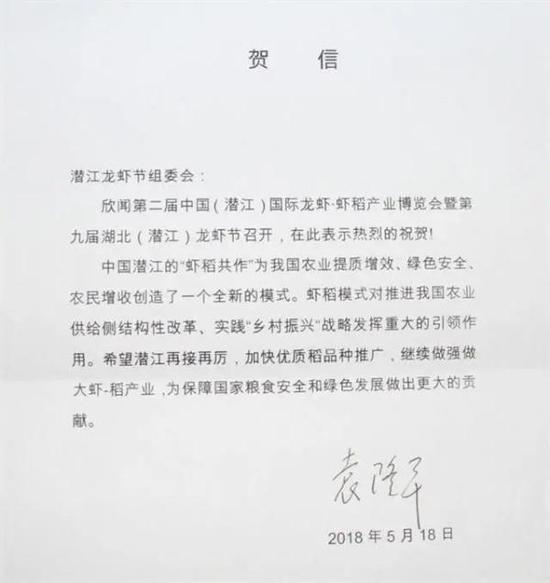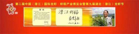 开幕式上,隆平高科公司副总裁陈志新宣读中国工程院院士袁隆平的贺信和“潜江虾稻”的题词。袁隆平盛赞:“中国潜江的‘虾稻共作’为我国农业提质增效、绿色安全、农民增收创造了一个全新的模式。”