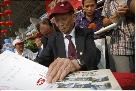 2009年10月6日,袁隆平院士在武汉四中110周年校庆上翻看校史簿。新华社 图