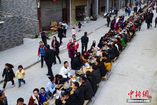 12月16日,游客在吃长桌牛瘪宴。当日,一场别开生面的“千人牛瘪宴”在贵州省榕江县忠诚镇上演,近千人坐在长达200余米的长桌边一起享用牛瘪火锅。牛瘪,又称“百草汤”,是黔东南地区独特的一种食品,深受少数民族民众喜爱,被视为待客上品。