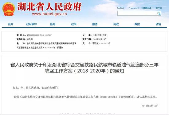 此前,湖北省政府官网发布了《湖北省综合交通铁路民航城市轨道油气管道部分三年攻坚工作方案(2018-2020年)》。