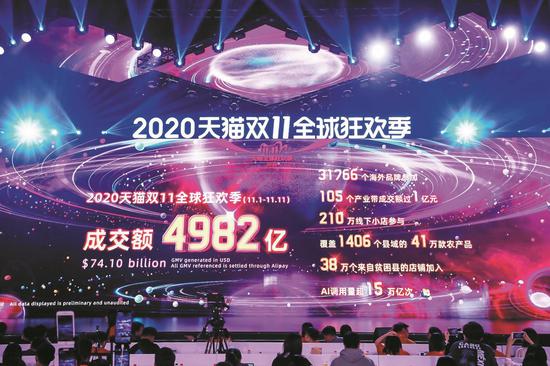 11月12日零时,2020年天猫双11最终的交易额,最终定格在4982亿元。