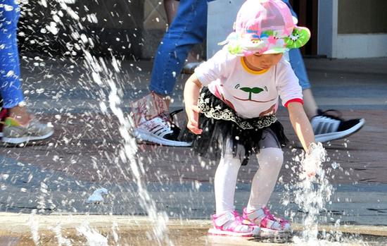 小朋友喷泉戏水 女士们短袖短裙出街。大街上,女士们短袖短裙,小朋友喷泉戏水,都在寻找各自的清凉。