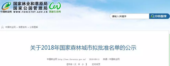 近日,国家林业和草原局发布《关于2018年国家森林城市拟批准名单的公示》。