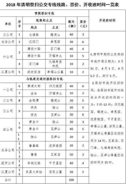武汉市公交办负责人介绍,各祭扫专线市内始发点开收班时间统一为7时-12时;归元陵园、睡虎山、孝恩园、流芳陵园、千子星空、幸福山公墓、回民公墓、万福净土等墓区收班时间为14时,王家店、石门峰、九峰寿安林苑、独山、玉笋山等墓区收班时间为15时。各扫墓专线将严格执行市物价部门核定的票价。