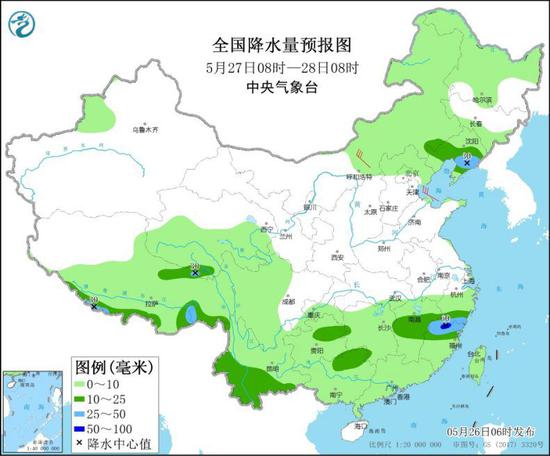 5月27日08时至28日08时,辽宁中西部、江南中部、贵州中部、广西北部、云南南部、西藏南部、青海南部等地的部分地区有中到大雨,其中,福建西北部等地局地有暴雨(50~60毫米);西藏南部高海拔地区有大到暴雪。内蒙古中西部等地的部分地区有4~6级风。
