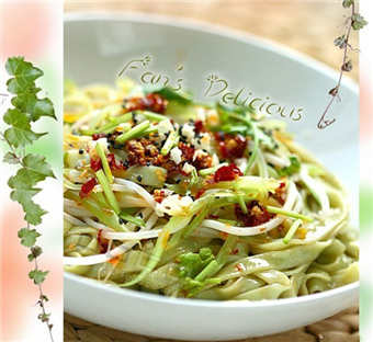 4.将煮好的意大利面捞起沥干水分,拌入少许香油后装盘,放上蔬菜丝,淋上作法2的酱汁即可。