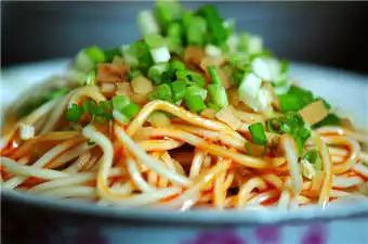 【做法】凉面的做法与他地相同:选新鲜细面下锅煮沸捞起,散开晾冷,用香油拌匀。面丝金黄油亮,散而不粘。