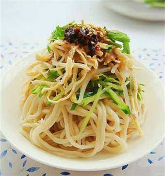 【材料】鲜切面250克、绿豆芽100、色拉油2大匙、香油2大匙、红酱油3大匙、醋1大匙、糖1大匙、味精或鸡精1小匙、花椒油1小匙、红油2大匙、大蒜3瓣(压成泥)