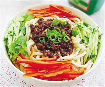 出锅的时候撒点葱白末儿,用以提味。(一次可以多做一点,吃不完的盛入玻璃瓶或保鲜盒中,放置冰箱冷藏,想吃就拿出来拌,吃一个星期没问题。)黄瓜、萝卜等切丝,黄豆、青豆等焯过去生即可(如果是正宗的炸酱面,应该按照规矩,根据季节的不同准备8样时蔬作为面码,以求口味的多样化和图个彩头)。