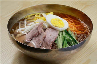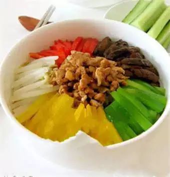 【基本材料】青瓜半条、酱牛肉50克、朝鲜冷面1包、沙梨1只、姜、芫荽少许。