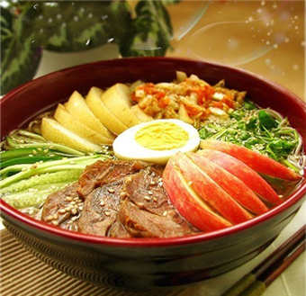 【材料】冷面面条350克、牛肉200克(牛排肉)、大葱一个、蒜4瓣、洋葱半个、萝卜100克、黄瓜半个、梨1/3个、鸡蛋2个。