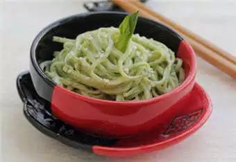【原料】绿色菠菜面100克、豆芽菜10克、紫圆白菜10克、胡萝卜20克