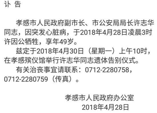 湖北日报讯(记者宋效忠)孝感市人民政府办公室28日发布讣告称,孝感市人民政府副市长、市公安局局长许志华同志因突发心脏病,于4月28日凌晨3时许因公牺牲,享年49岁。许志华同志遗体告别仪式定于30日上午10时在孝感殡仪馆举行。