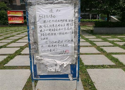 昨日上午,楚天都市报记者来到江山如画三期,看到花坛里有一处约30平方米的空地,刚浇筑了水泥,无人施工。小区一处宣传栏上张贴着一份由小区业委会6月7日发出的通知(如图),内容是针对小区选址安装快递柜一事,有不同意见的业主可到业委会办公室签名,业委会将按照《物业法》做最后决定。