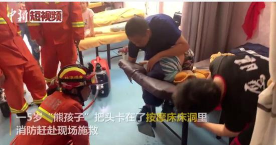 7月9日,湖北汉川一按摩店内,一名5岁男孩在玩耍的时候不小心把头卡在了按摩床床洞里面,家人怎么扯都扯不出来。当地消防赶赴现场施救,只用了2分钟就把孩子毫发未损的救出。