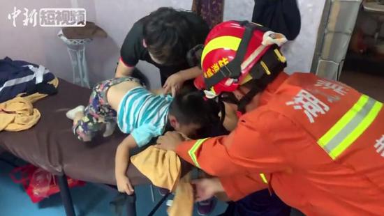 湖北汉川一5岁男孩头卡按摩床 消防现场切床救娃