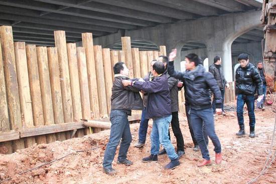 现场被殴打的执法队长曾勇告诉记者,当时他们要求对方停止施工,不料对方一名负责人大喊:“你说的算什么,我们只听江北指挥部的,指挥部下命令要我们赶工期,不管你执不执法,我们都要搞下去。”